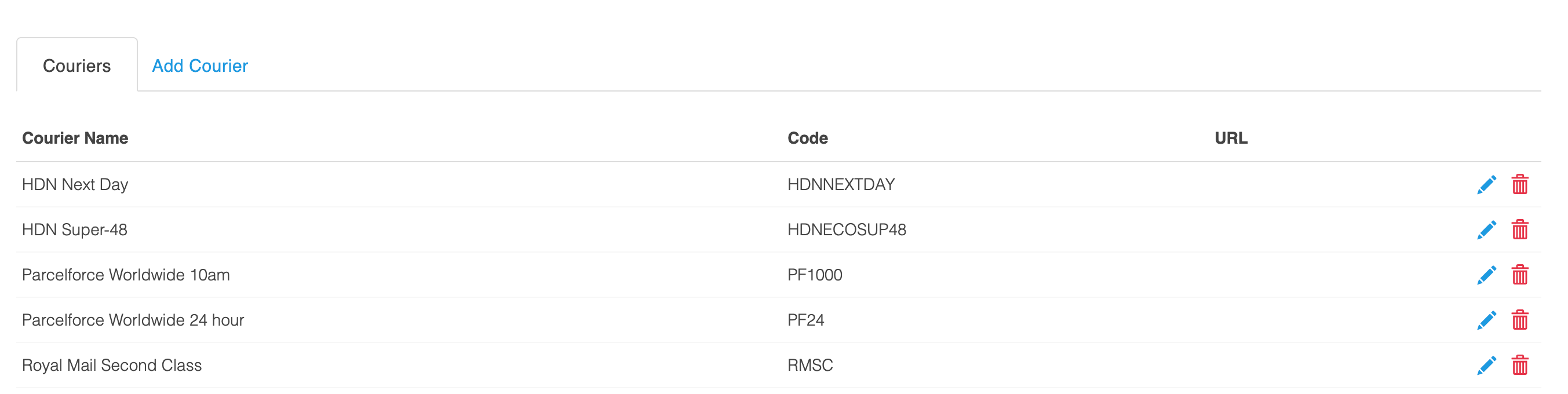 You'll be presented with a list of couriers that are already set up on your store. Here you can add new couriers, which can then be assigned to shipping rules. You can also amend and delete existing couriers.