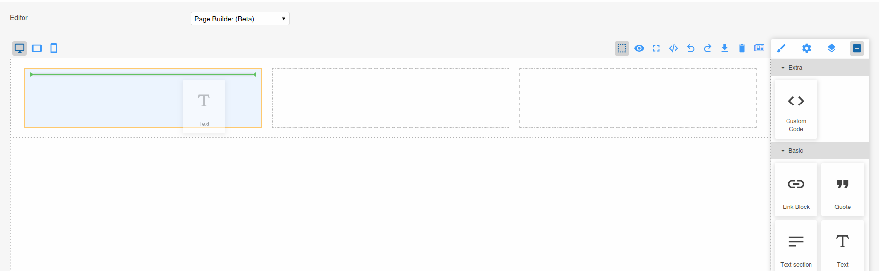This will appear as follows when added to the Page Builder. This screenshot also shows a Text component being dragged onto one of the droppable areas: