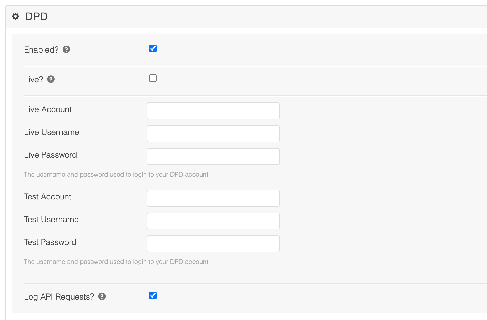 Log API Requests? | When active, all requests to the DPD Interlink API will be logged to the Aurora Integration Log for your reference. |