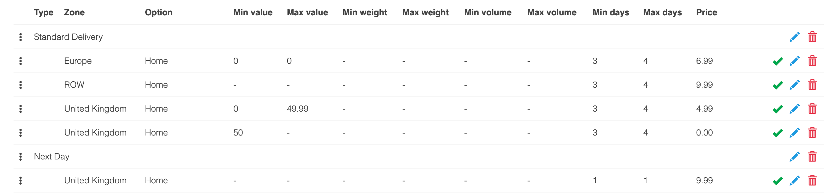 Shipping Rules - Each shipping type can comprise of several shipping rules. These can be used to vary the price a customer is charged for that shipping method based on the contents of their basket. For example, a "Standard Delivery" shipping type may be comprised of the following rules: