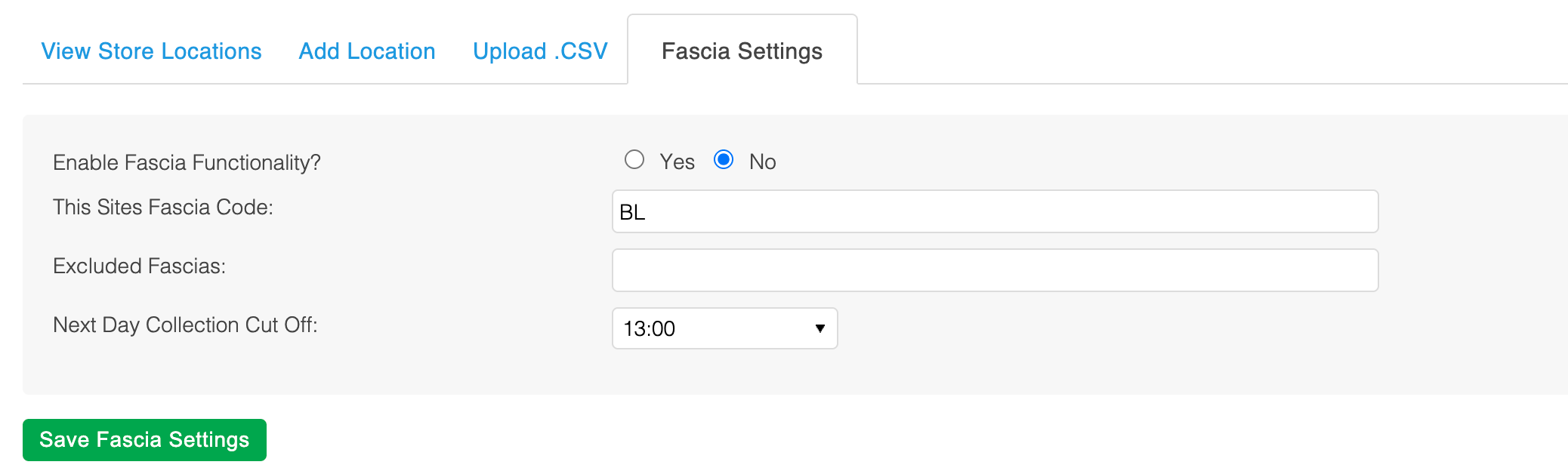 To enable store finder with combined fascia results, you must need to enable the fascia functionality first. To do that, go to Orders > Shipping > Stores > Fascia Settings and tick the Enable Fascia Functionality checkbox, followed by the save button: