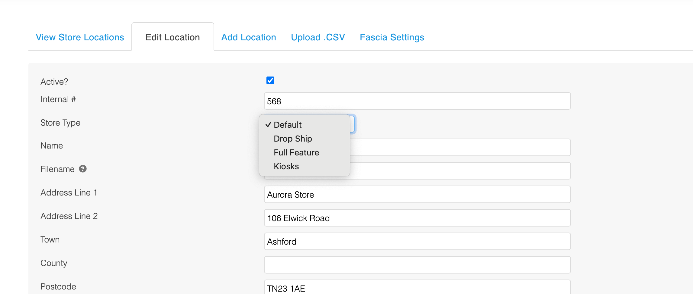To use the configured store types, edit a store by navigating to Orders > Shipping > Stores > All Stores > Edit, set the Store Type field and save changes: